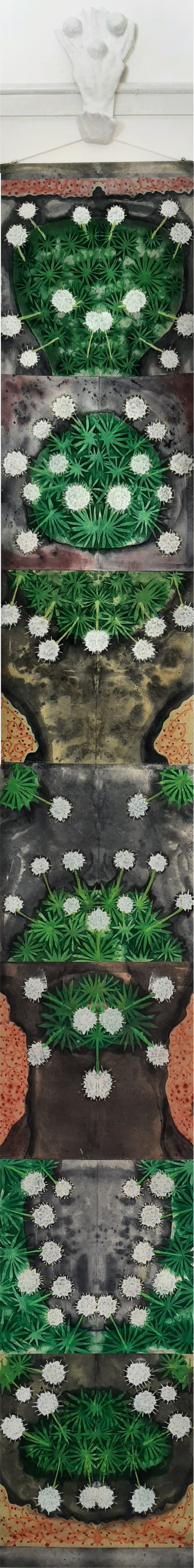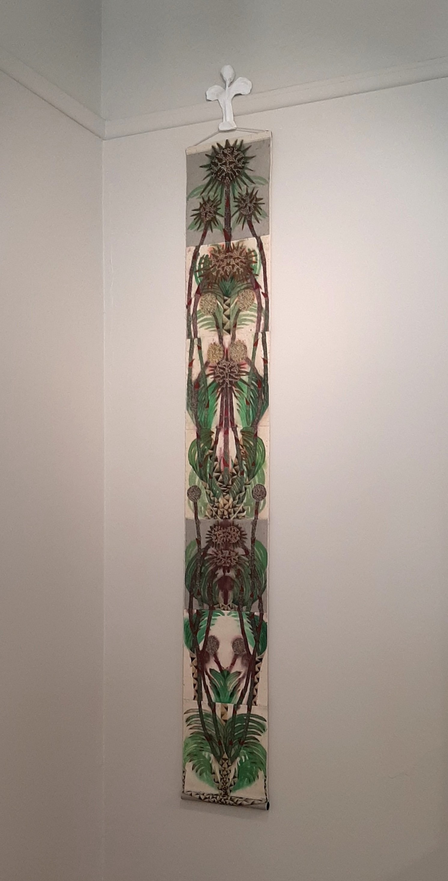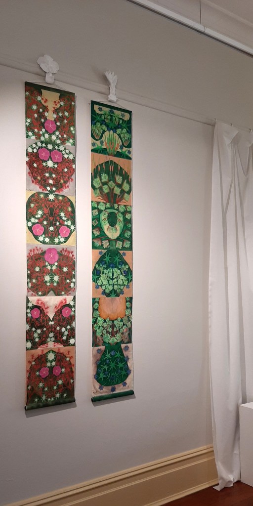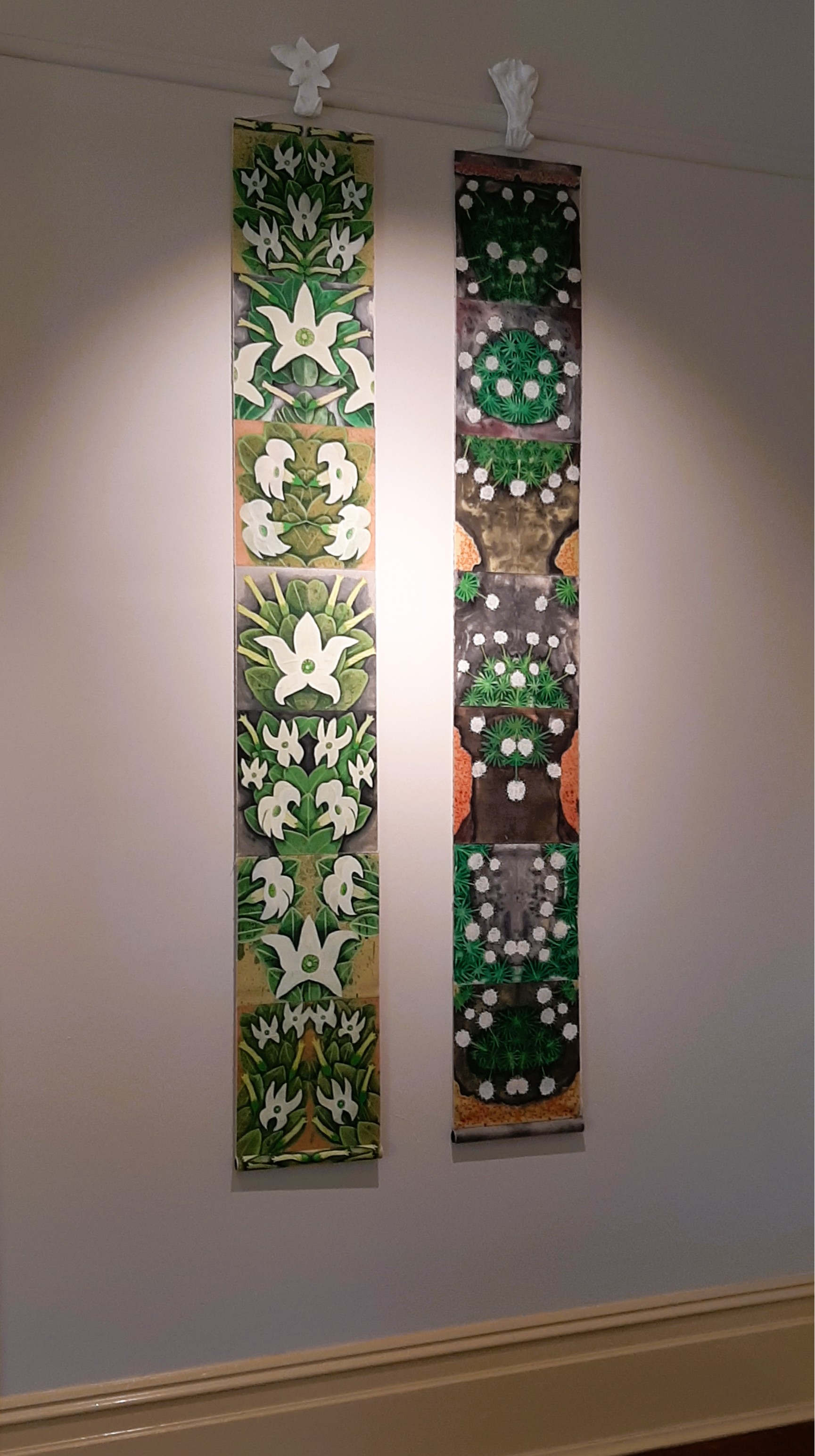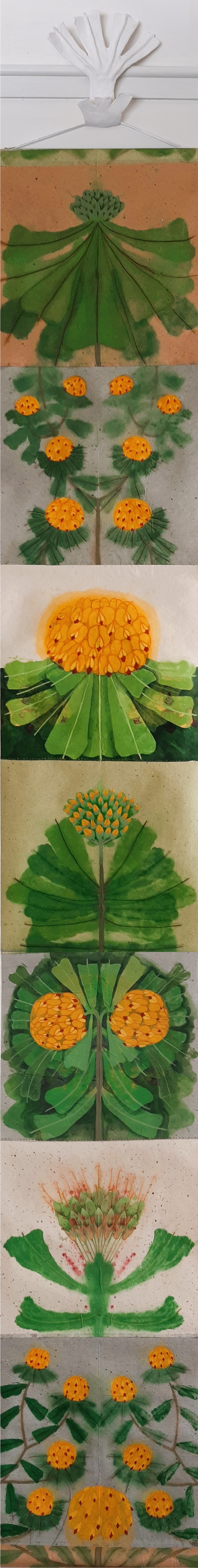 Featuring artworks inspired by plant species of Southwest of Western Australia, which I encountered during an artist’s residency in Albany. This region is a global biodiversity hot spot, renowned for its hyper diverse flora, shaped over hundreds of millions of years. I spent a lot of time in the landscape learning about these plants. The process of identifying plants relies on using the senses, particularly sight, touch, and smell to find traits in common with familiar plants. Using sense memory simultaneously focuses the attention to the “here and now” while accessing memories of the past. In parallel, the interaction between the senses and materials while making art, creates a state that is both focused in the present while exploring past experiences. Each artwork consists of a scroll, hanging on a corresponding papier mâché hook. The hook is a literal connection of the artworks to the “here and now” of the exhibition space and acknowledges the nature inspired decorative elements in the architecture of Braemar house.