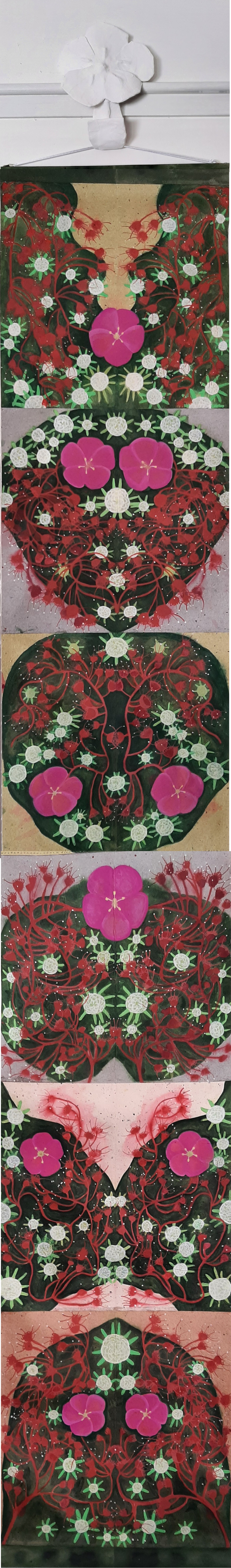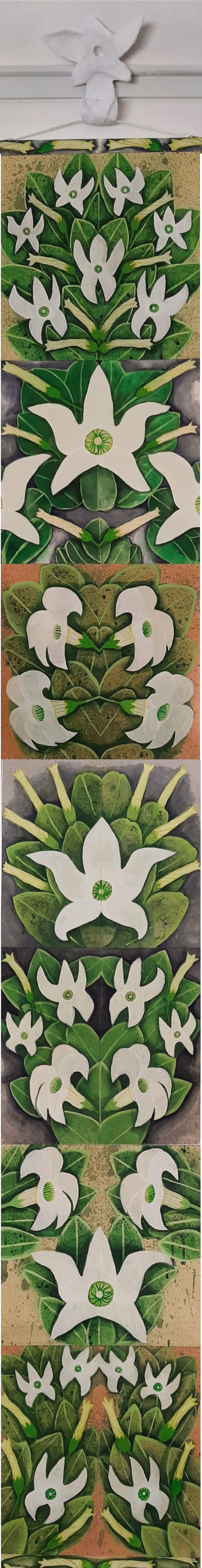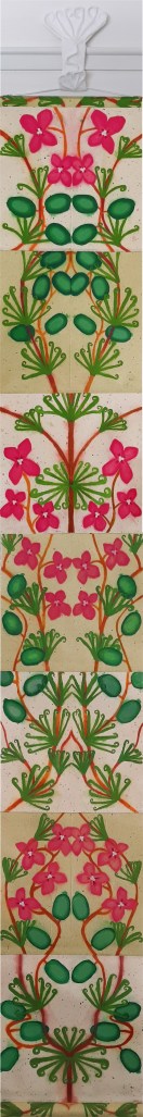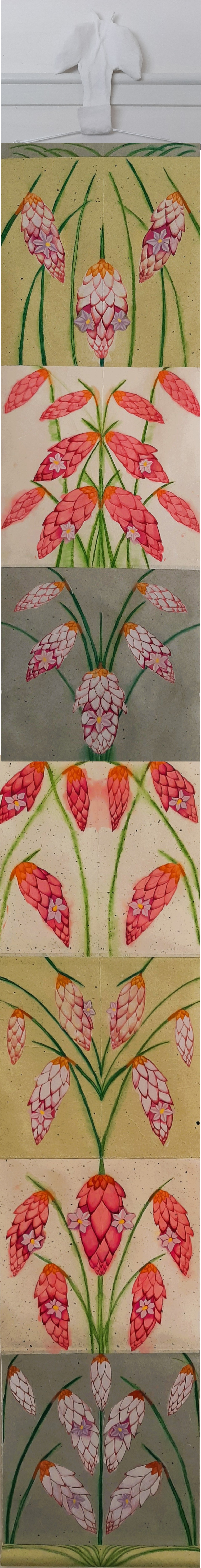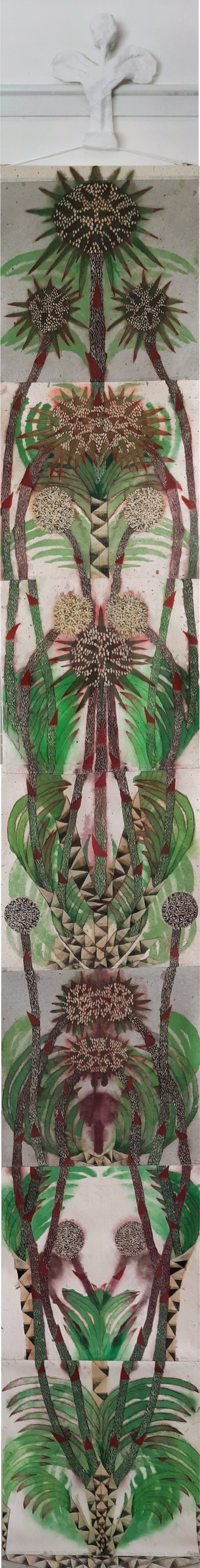 Featuring artworks inspired by plant species of Southwest of Western Australia, which I encountered during an artist’s residency in Albany. This region is a global biodiversity hot spot, renowned for its hyper diverse flora, shaped over hundreds of millions of years. I spent a lot of time in the landscape learning about these plants. The process of identifying plants relies on using the senses, particularly sight, touch, and smell to find traits in common with familiar plants. Using sense memory simultaneously focuses the attention to the “here and now” while accessing memories of the past. In parallel, the interaction between the senses and materials while making art, creates a state that is both focused in the present while exploring past experiences. Each artwork consists of a scroll, hanging on a corresponding papier mâché hook. The hook is a literal connection of the artworks to the “here and now” of the exhibition space and acknowledges the nature inspired decorative elements in the architecture of Braemar house.