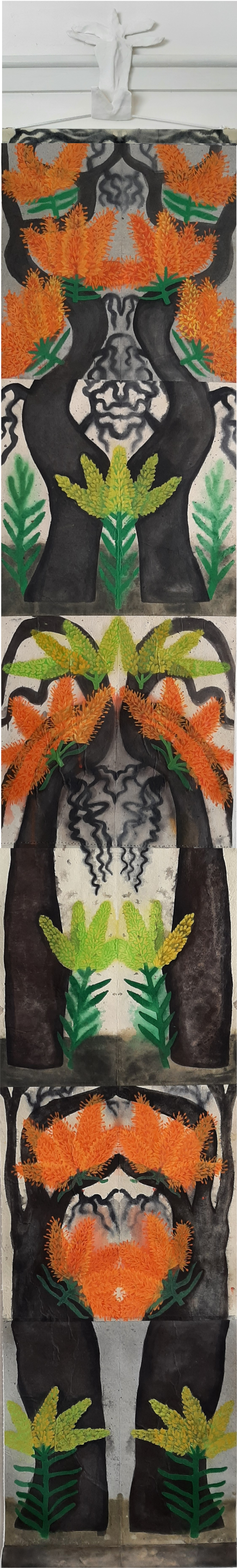 Sticky Tailflower 2025, scroll: acrylic on mulberry paper, canvas and wood 213 x 30.5 cm, hook: gesso on papier mâché, 16 x 16 x 4 cm